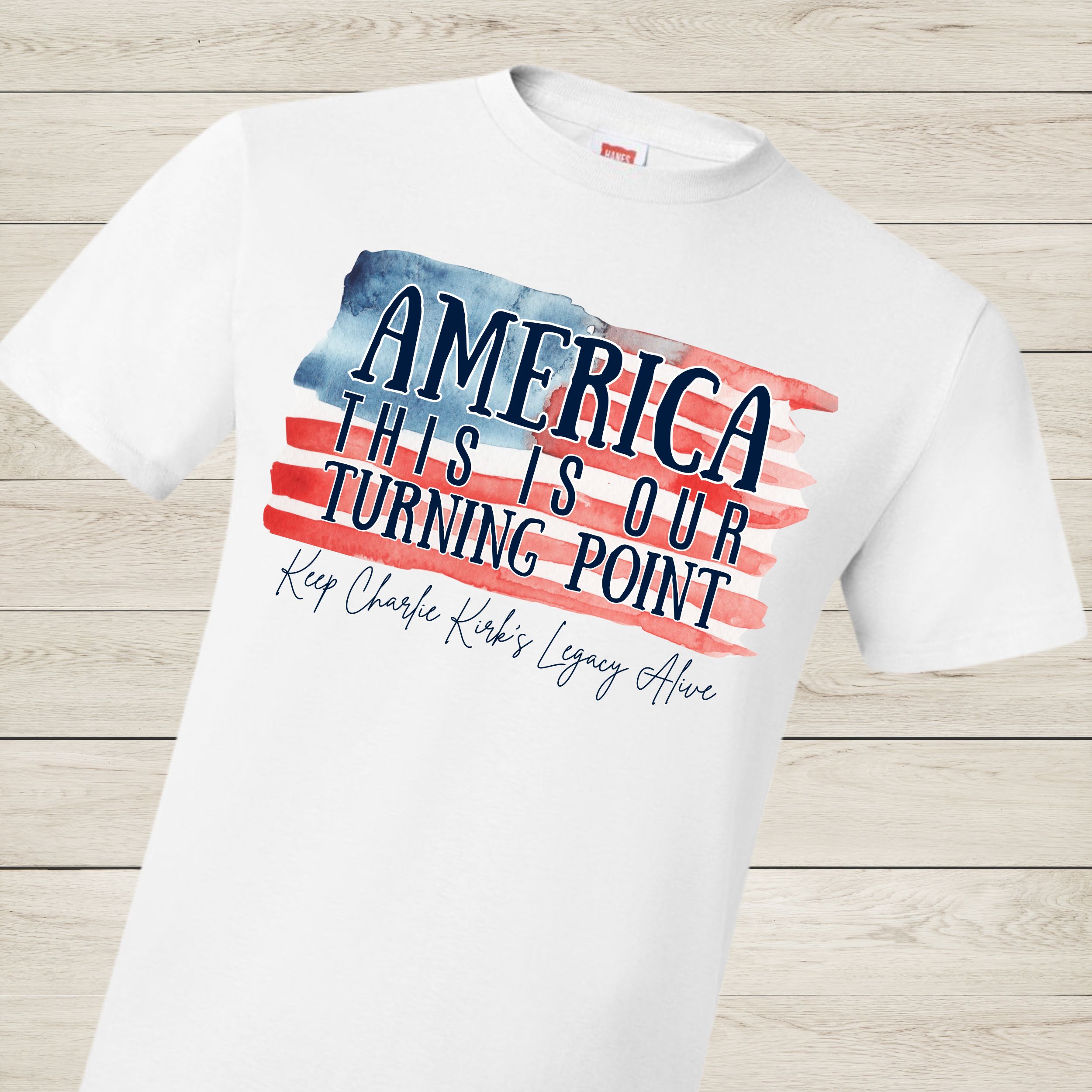 Stand tall for freedom and values with this powerful patriotic t-shirt featuring a bold watercolor American flag background and the words “America This Is Our Turning Point.” At the bottom, the heartfelt phrase “Keep Charlie Kirk’s Legacy Alive” honors his impact and influence. This design is more than just a shirt – it’s a statement of unity, strength, and the belief that our country is at a pivotal moment in history.
