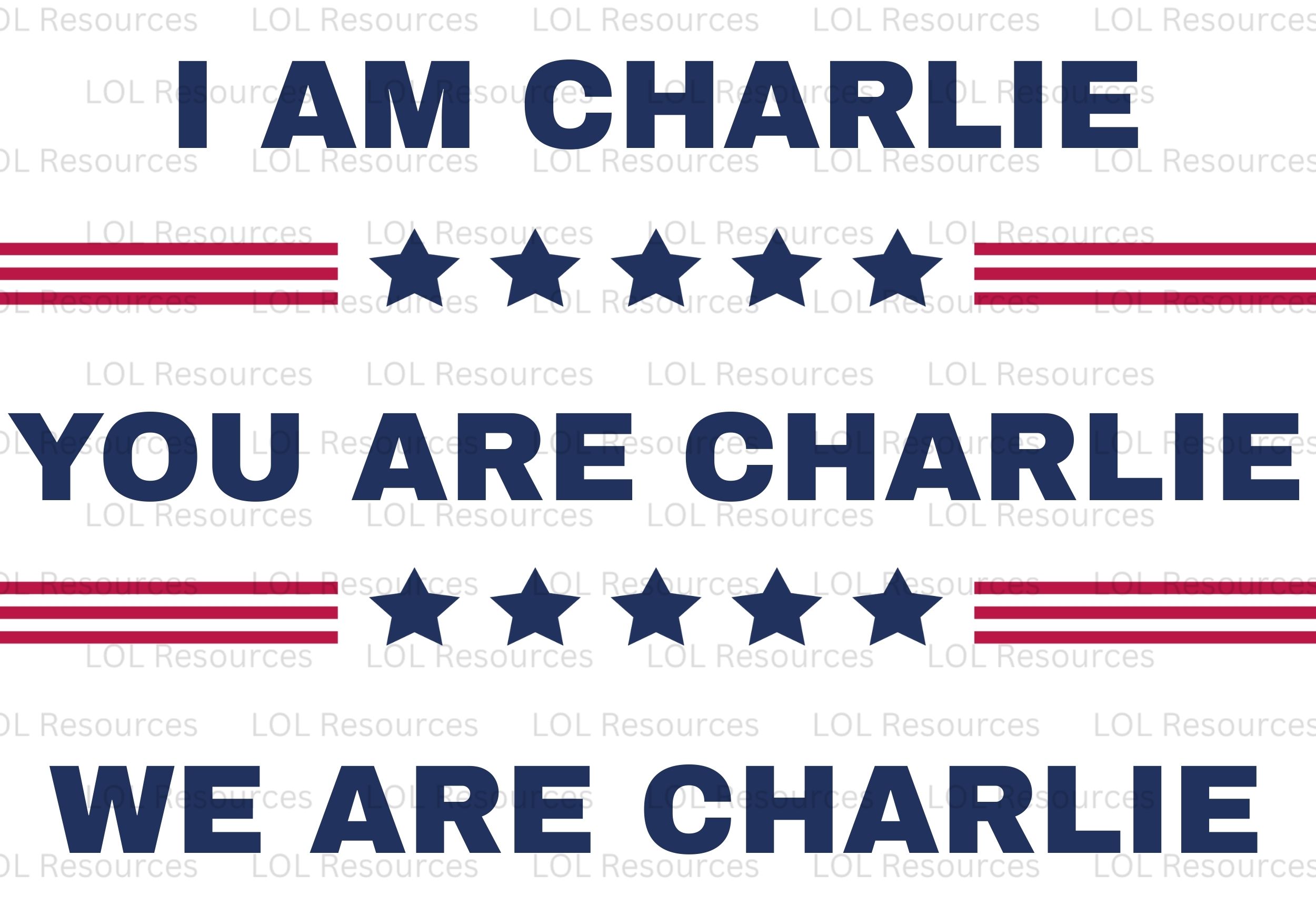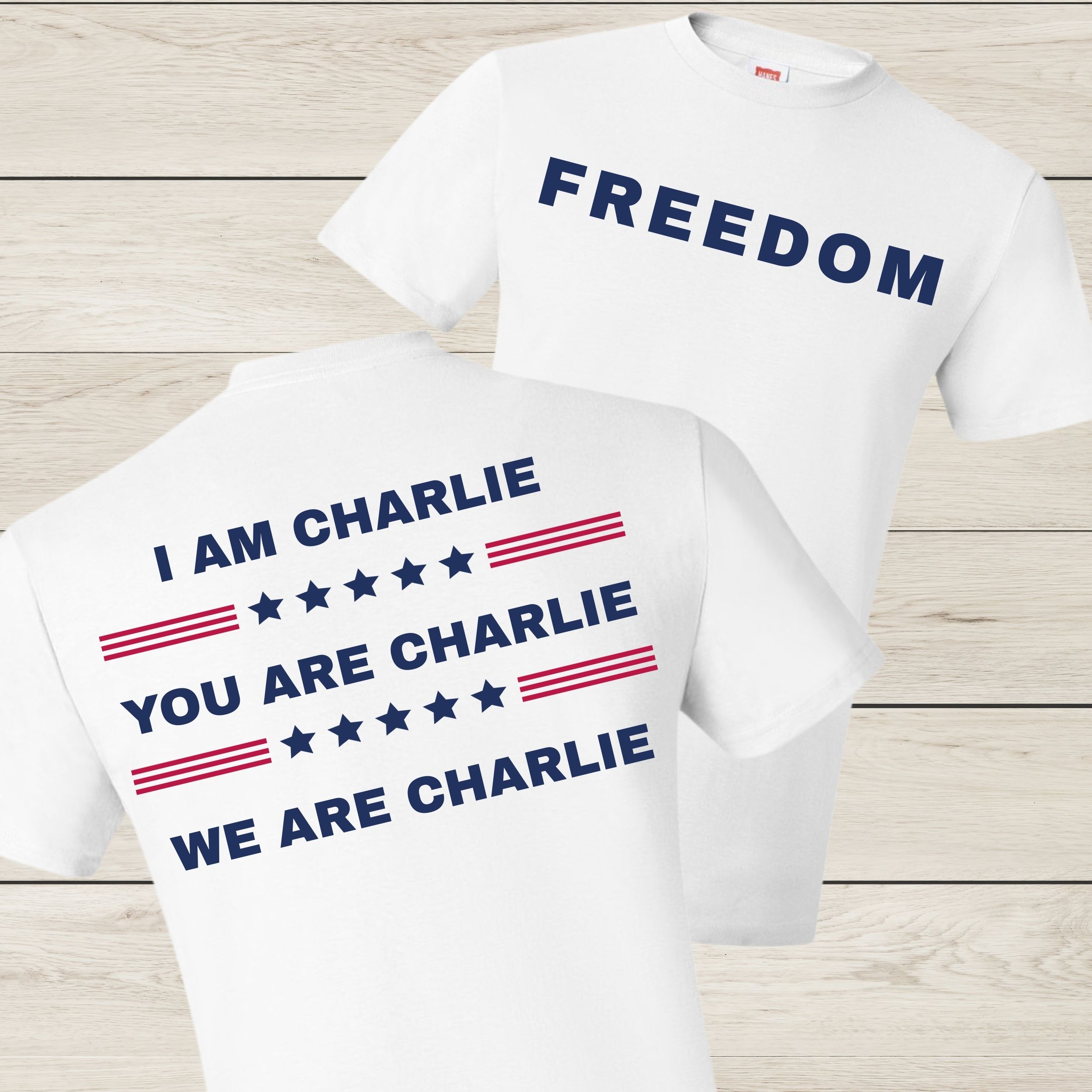 The front keeps it clean and powerful with one word: FREEDOM—printed in bold navy letters that demand attention without saying too much. On the back, the message expands into a declaration of solidarity: “I AM CHARLIE. YOU ARE CHARLIE. WE ARE CHARLIE.” Framed by red stripes and navy stars, the design captures the spirit of courage, community, and conviction.